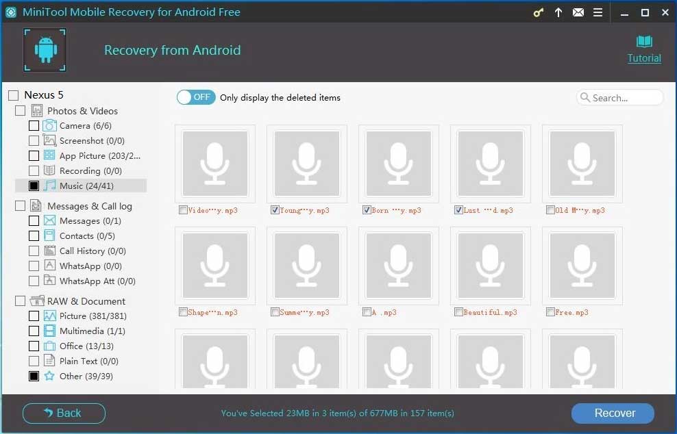 For example, if you want to recover the deleted music files from your Android device, you need to choose Music from the left side, check the files you want to recover and click on Recover button to continue.