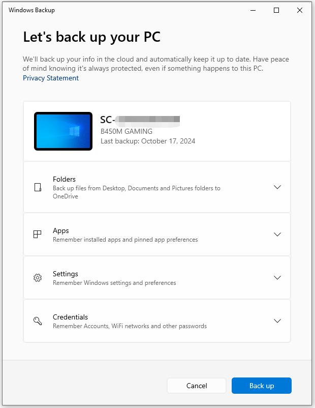Option 2: Back up MSI Laptop via Windows Backup App