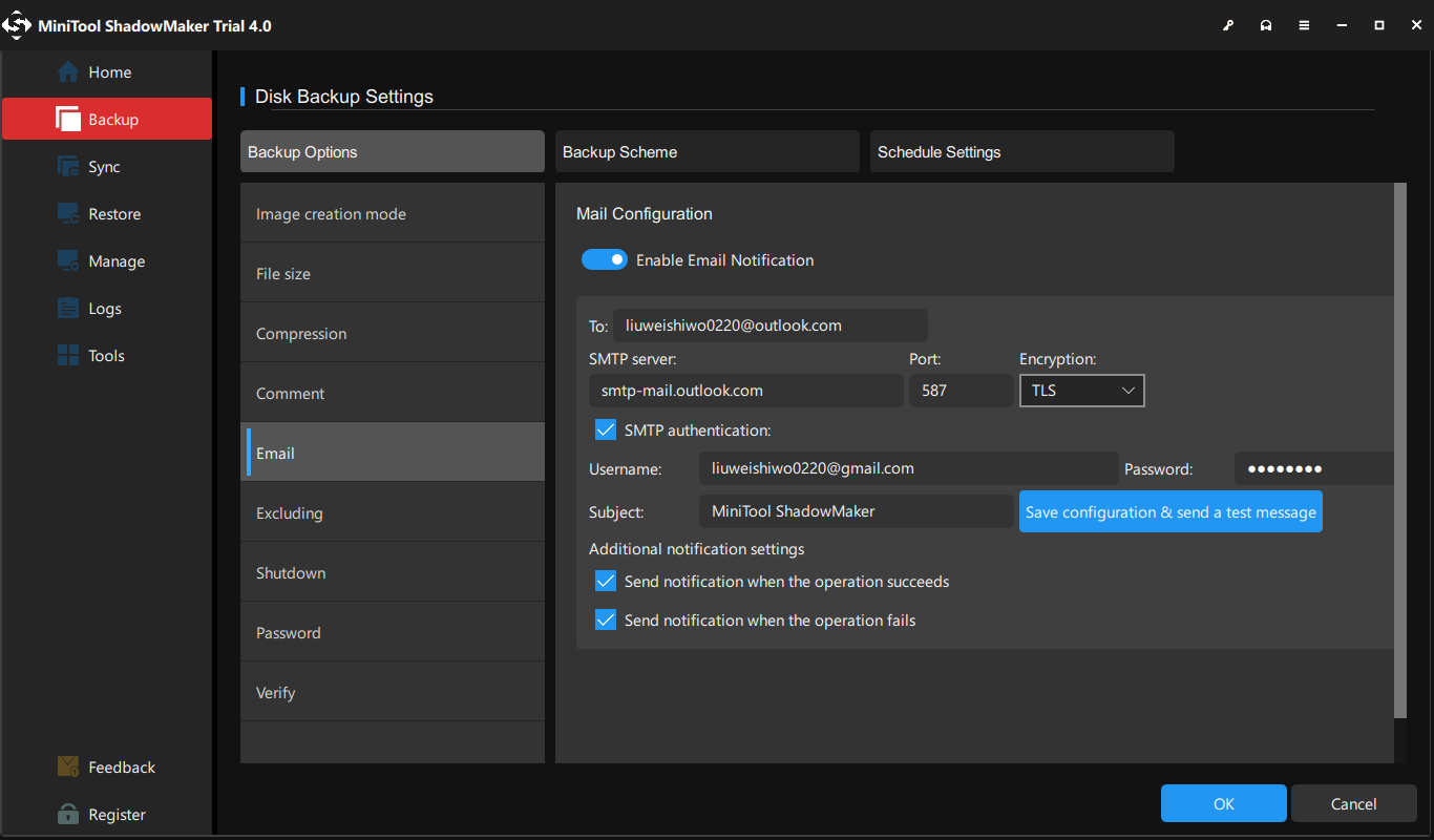 After trigger on the Enable Email Notification button, MiniTool ShadowMaker will send an email to inform you whether the backup task is successful or failed when the backup operation is finished. You need to customize the followings:
