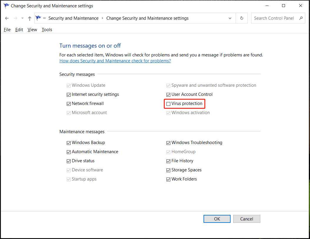 Step 4: Disable virus protection security messages and click OK to save the change.