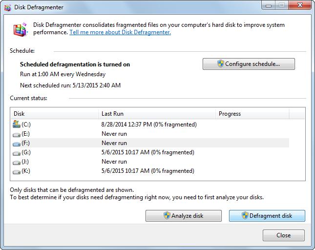 Start “Search programs and files” to input Disk Defragmenter > Click “Disk Defragmenter” > Click the volume that you want to defragment > Click “Defragment Disk”.