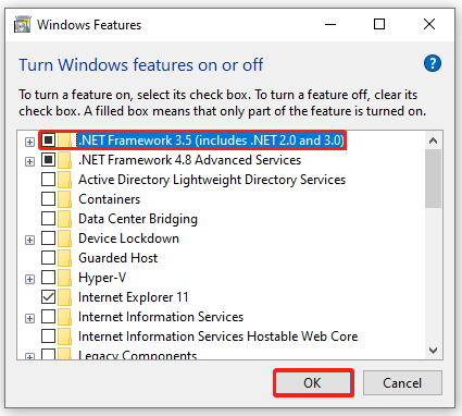 Passo 3. Marque o .NET Framework 3.5 (se houver, inclua o .NET 2.0 e 3.0) e pressione OK.