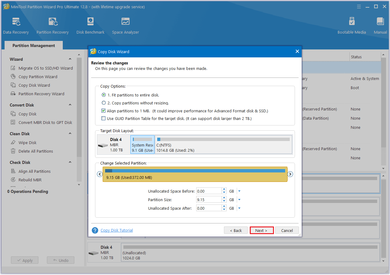The Copy Disk feature in MiniTool Partition Wizard will completely copy the source disk data to the larger disk, allowing you to better free up disk space.