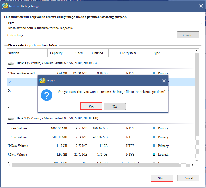 Step 4. Select a partition from this interface, click on Start! and then press on Yes from the pop-out window to start the restoring process.