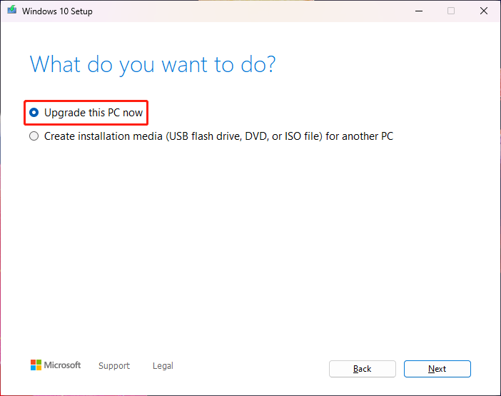 Step 4: On the next page, select Upgrade this PC now and click the Next button.