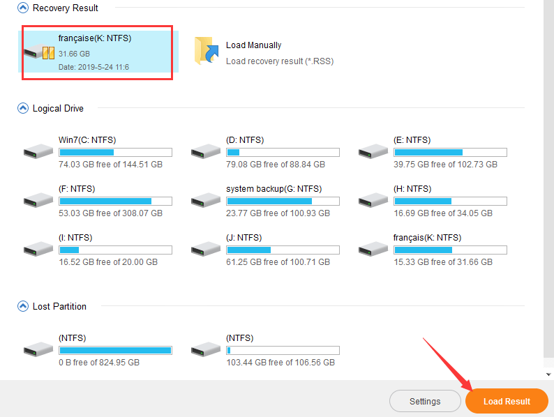 Step 1: if you already closed the program, please run the program again and load the previous recovery result, which can avoid rescanning the drive: