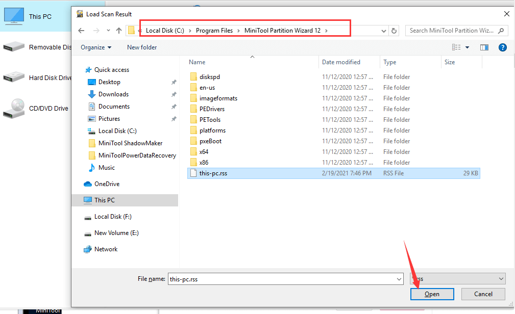 Please navigate to the installation folder of Partition Wizard Free/Demo version (default path is C:\Program Files\MiniTool Partition Wizard 12\) and locate the .rss file which is the scanning result of Partition Wizard: