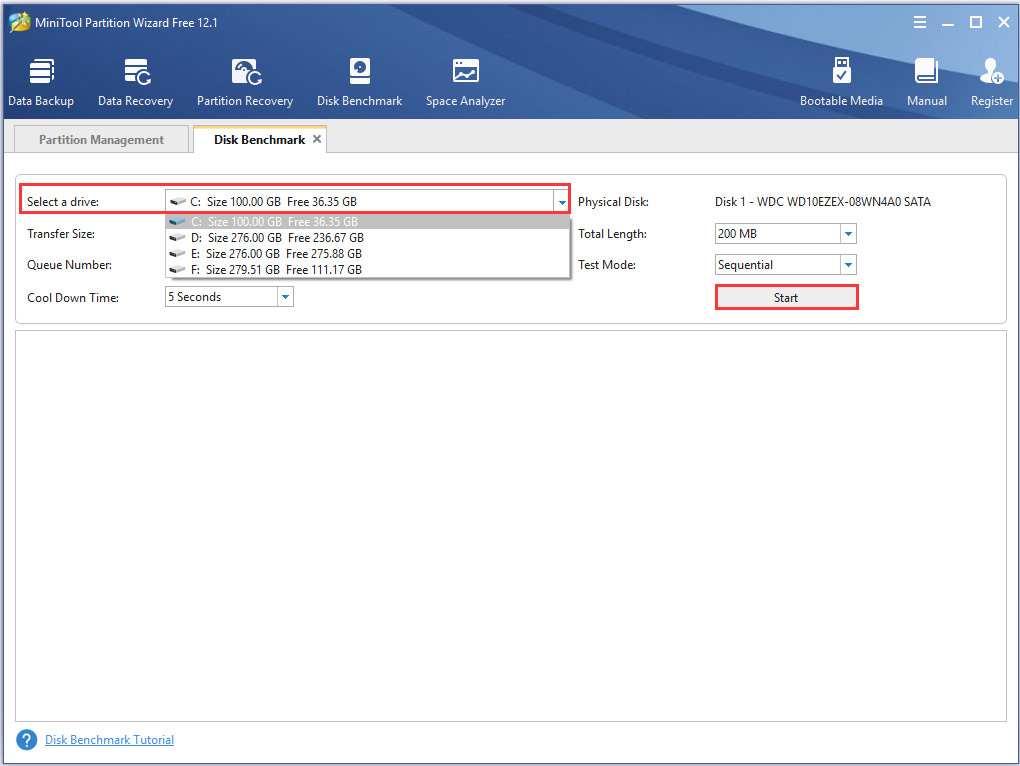 Step 2. Select the drive letter of your SSD from the drop-down menu, and then you can further specify the test parameters including Transfer Size, Transfer Length, and Test Mode by clicking on the corresponding buttons. After that, click on the Start button.