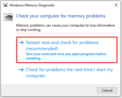 Step 2. In the pop-up window, select Restart now and check for problems (recommended).
