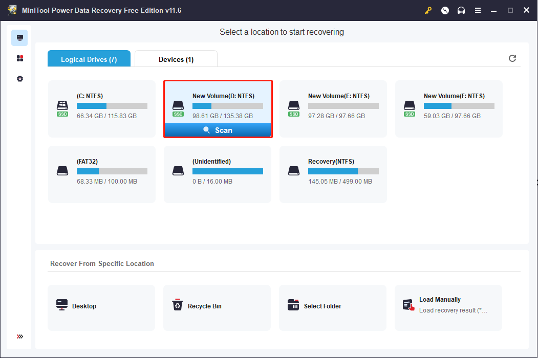 Step 2: Launch the software. In the Logical Drives section, you need to choose the partition in which you have performed CHKDSK commands and contains the deleted/lost files, then click on the Scan button.