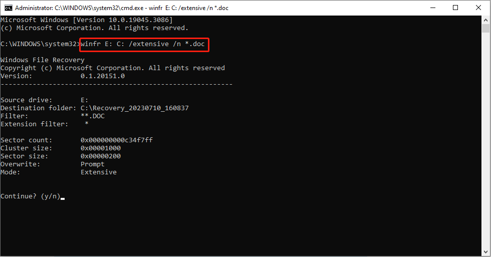 Step 3: Type winfr source-drive: destination-drive: [/mode] [/switches] and hit Enter.