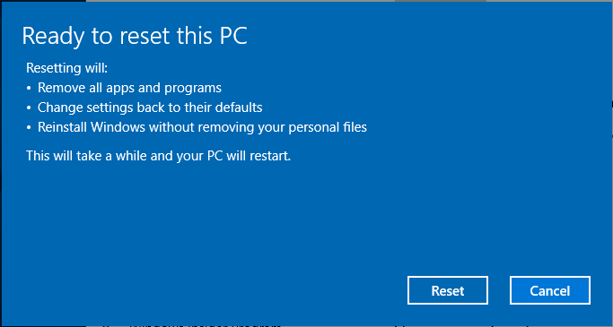 Step 5: In Ready to reset this PC interface, click the Reset button to reinstall Windows 10 without CD or loss of personal files.