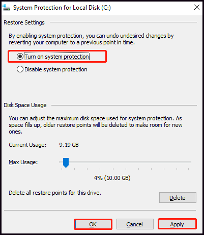 Step 3: Check the switch of Turn on system protection and then click Apply and OK to save the change.