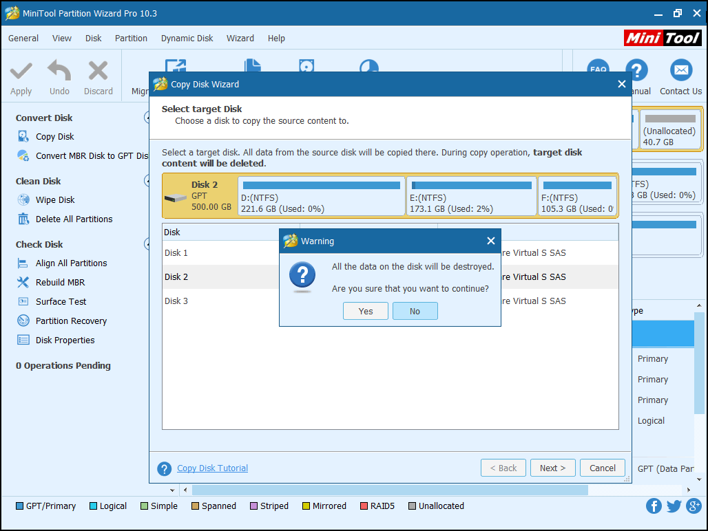 Step 1: to clone hard drive data, you should select the disk you want to copy and click on “Copy Disk” from the left action pane. On the first pop-out window, you need to select the target disk which you want to use as the alternative disk and press “Next” to continue.