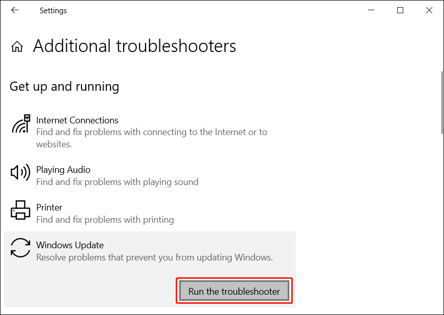 Step 4: On the next page, click Windows Update under Get up and running. Then, click the Run the troubleshooter button to run this tool.