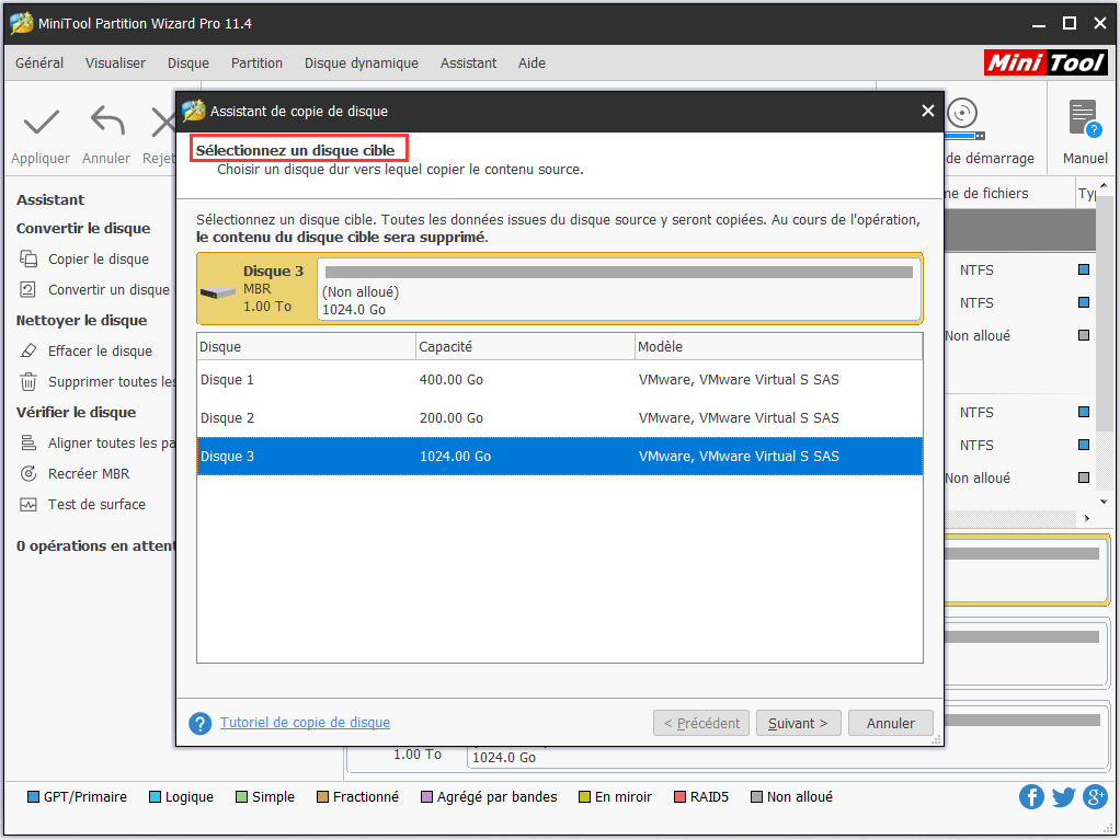 Étape 2 : Choisissez un disque cible pour contenir tout le contenu du disque source. Prenez note que toutes les données sur le disque cible seront nettoyées ; assurez-vous donc que ce lecteur peut être nettoyé ou qu’une sauvegarde a été préalablement faite.