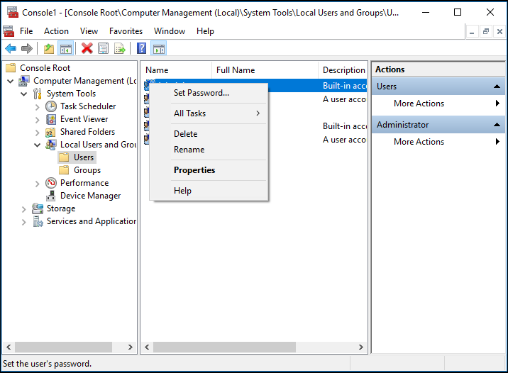 Passo 9: Clique com o botão direito do mouse em “Administrador” e selecione “Definir senha”. Você deve definir uma senha forte para começar.