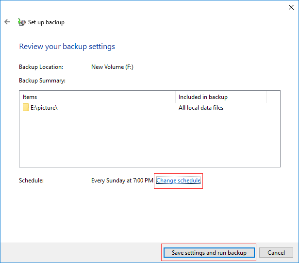 Passo 7: revise suas configurações de backup. Se quiser definir um backup automático ou alterar o agendamento de backup, clique em Alterar agendamento para continuar. Por fim, clique em Salvar configurações e executar o backup para executar a ação de backup de dados.