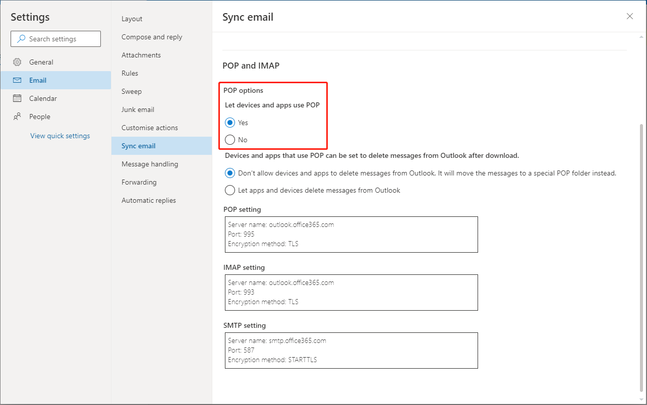- Under POP and IMAP, select Yes from the Let devices and apps use POP section.