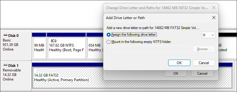 Step 3: Click Add, then assign a drive letter for the SD card.