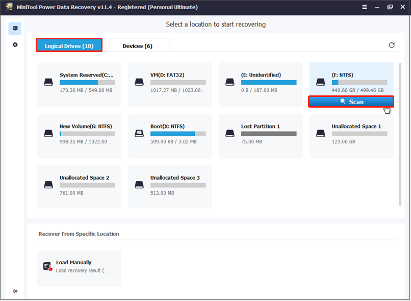 Step 3. Under the Logical Drives section, select the target drive and click Scan (You can also click the Devices tab and choose to scan a whole disk).