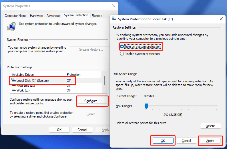 3. Make sure the protection for the system disk is on. If it is off, you need to select the system disk under Protection Settings and click the Configure On the next page, select Turn on system protection. Then, click Apply and OK to save the setting.