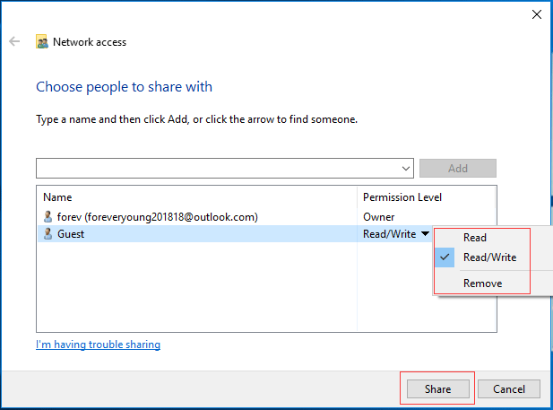 Step 4: Next, please input guest in the box and click Add to continue. Change the permission to Read/Write and click the Share button to continue.