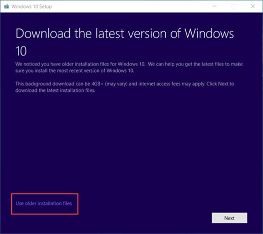 Step 3: Then Windows will suggest that you should download the latest version of Windows 10, just ignore the information and choose Use older installation files and finish the operations by following its pop-up instructions.