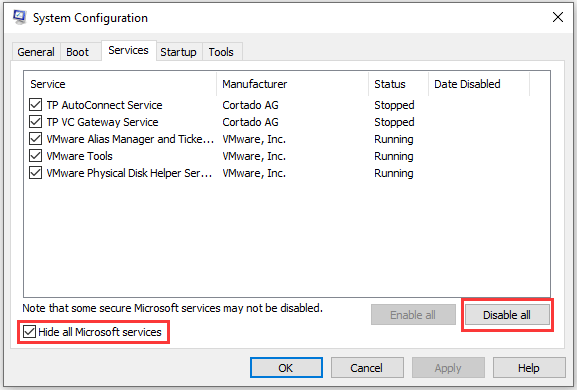 For instance, you can re-enable the top half of all the non-Microsoft related services (the ones that are important to Windows should be hidden in the fourth step). After restarting your computer, you can go to see if the issue happens again. If not, you need to re-enable the rest half non-Microsoft services to have a try again. If the issue appears, you can know that the conflicting service is in the lower half ones.