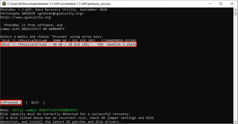 Step 1. Open PhotoRec and navigate using the Up/Down arrow keys to select the disk or partition where the lost files are located. Press Enter to validate your choice and continue with the recovery operation.