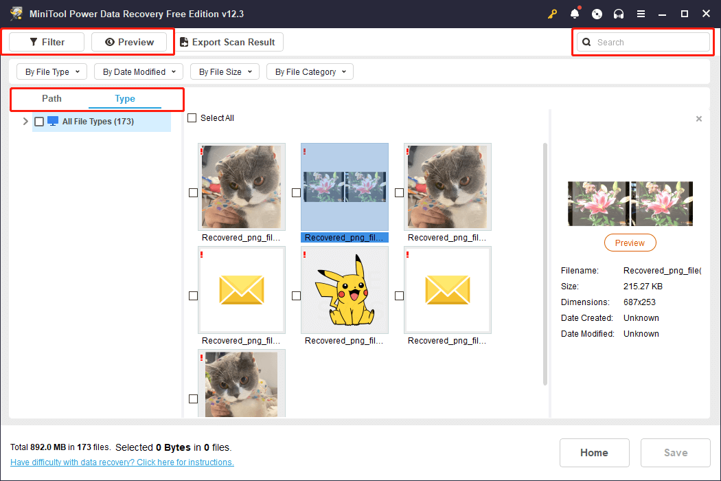 - Preview: This option is particularly useful for confirming that the recovered files are the ones you want. MiniTool Power Data Recovery Free Edition only permits saving up to 1 GB of files for free, so it’s essential to preview them first. You can easily double-click on an individual file to preview it.