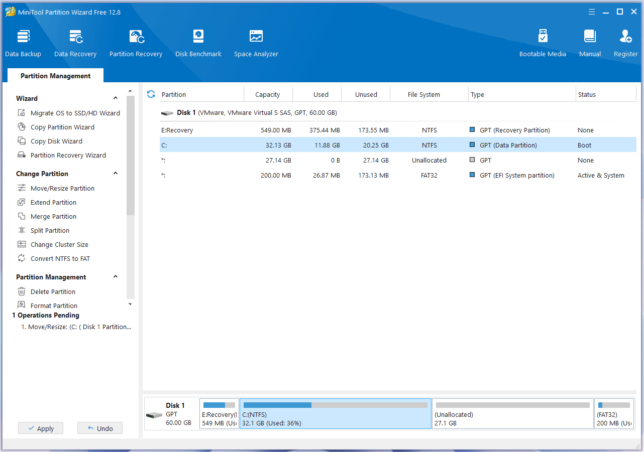 Paso 3: Comprobar el diseño de la partición y hacer clic en Aplicar para ejecutar la operación. Haz clic en Sí para confirmar la operación. Si has movido/redimensionado la unidad C, tendrás que reiniciar el PC.