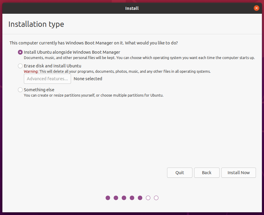 - Elegir el Tipo de instalación. Recomendamos instalar Ubuntu con el gestor de arranque de Windows. (Windows Boot Manager) Después, haz clic encima de Instalar ahora.
