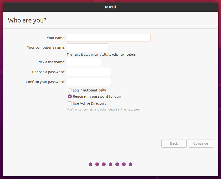 Paso 7: Elegir tu zona. Esto se encuentra relacionado con la hora que se muestra en Ubuntu. Luego, introduce tu nombre y el nombre que quieras para tu ordenador. Elige también un nombre de usuario y una contraseña.