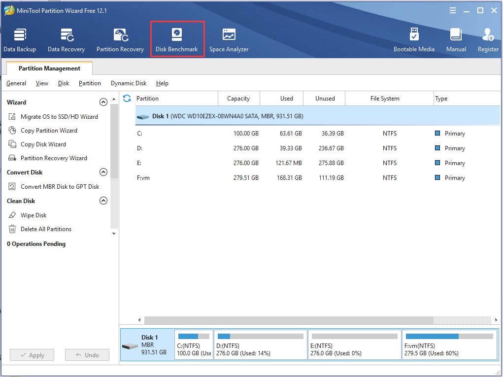 Passo 1. Inicie este programa para entrar em sua interface principal e clique no recurso Benchmark de Disco na barra de ferramentas superior.