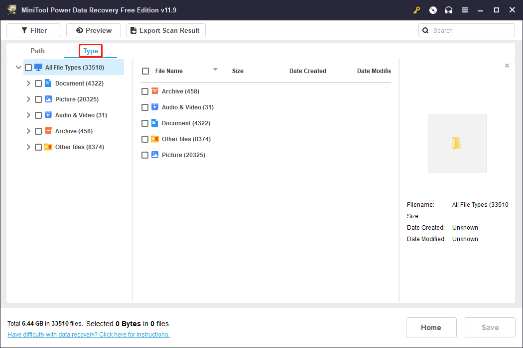 The found files are listed in different folders in a tree structure under the Path category list. Clicking on the Type button next to Path, you can check files according to their types, like pictures, documents, videos & audio, etc.