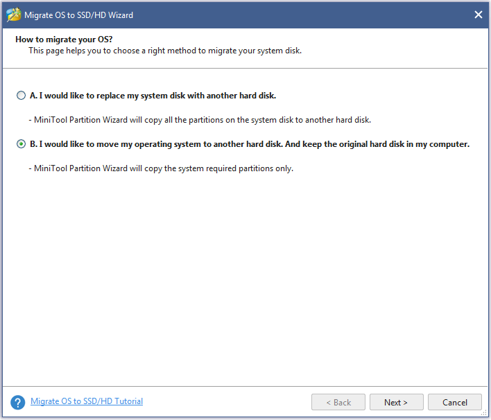 In both cases, if users don’t want to reinstall Windows and programs or don’t want to lose anything, we highly suggest using Migrate OS to SSD/HD feature of MiniTool Partition Wizard to do this, which is an easy and safe process.