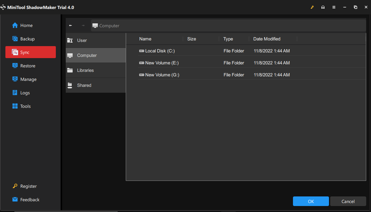 Location 3: Click Computer and select a drive to sync (We can choose to sync to external hard drive, internal hard drive, or removable USB flash drive). Then click OK.