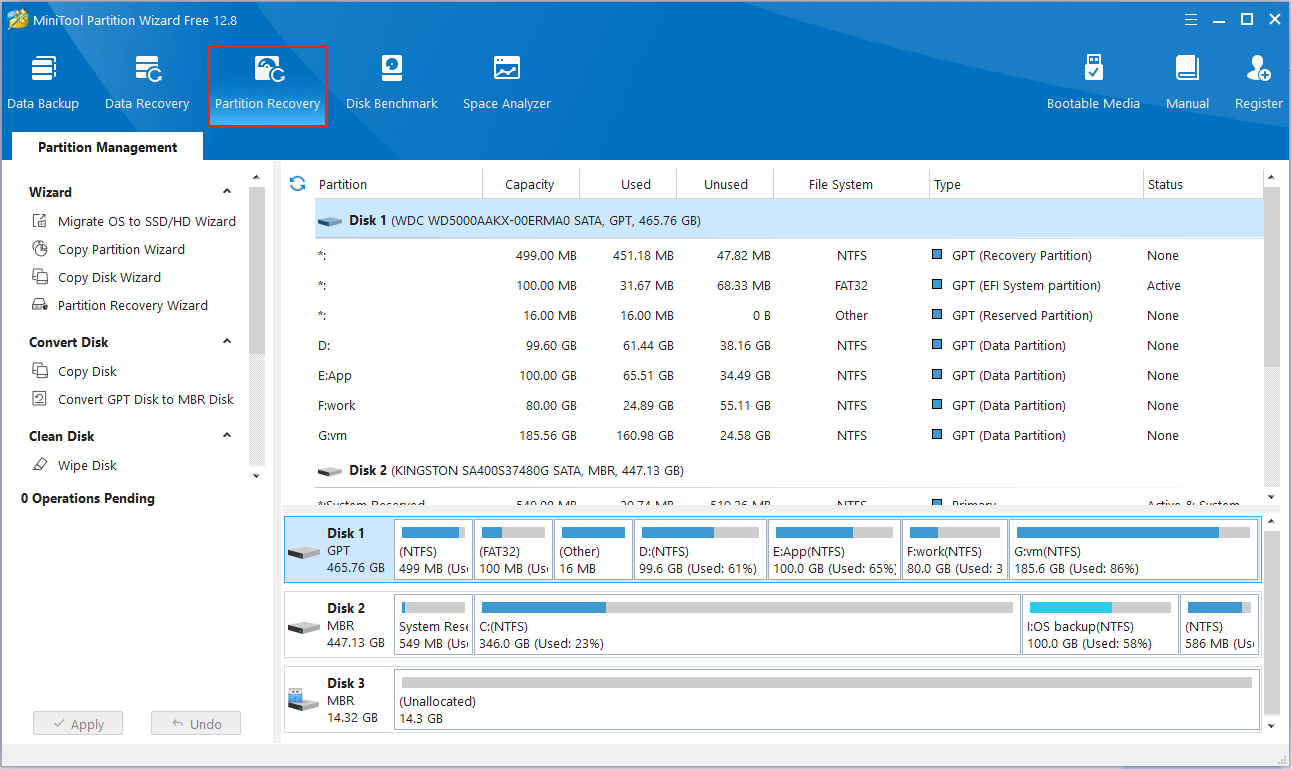 MiniTool Partition Wizard is a professional and green partition management tool that helps recover a deleted partition with data on it. Besides, it enables you to create/delete/move/resize/extend/shrink disk volumes, clone a hard drive, convert MBR to GPT, etc.