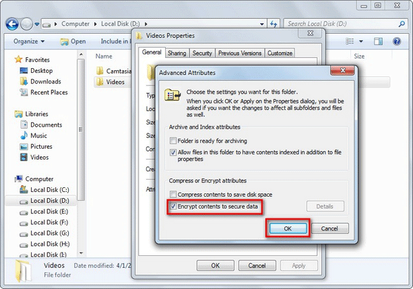 Step 3: check “Encrypt contents to secure data” in “Advanced Attributes” interface and then press the “OK” button to continue.