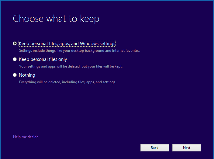 Step 9: Then, three options are offered. If you need to reinstall Windows 10 without losing data and apps, please check Keep personal files, apps, and Windows settings.