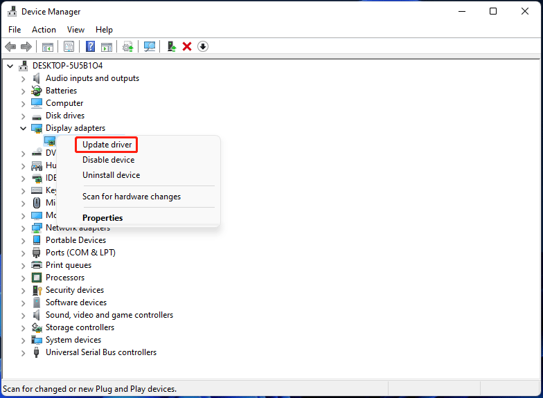 Étape 2: Développez Adaptateurs d’affichage, faites un clic droit sur le pilote GPU et choisissez Mettre à jour le pilote.