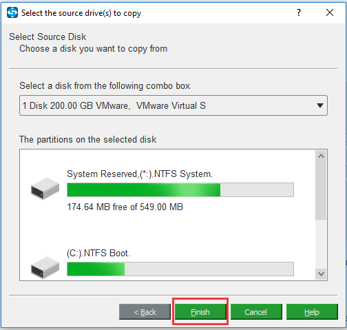 Passo 4: Clique no módulo Origem para selecionar o disco de origem. Aqui, é recomendável optar por clonar o disco do sistema operacional no SSD. Clique em Concluir para continuar.